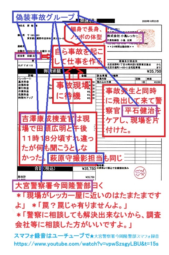 吉澤捜査官がその人物に何も質問しなかったことも、裏事情を知っていた証拠でしょう。平石健治は警官から「あの人は?」と聞かれる事は予期していなかったのだ。だからあのように慌てて「関係ありません。目撃者です。」と答えた。警官の内二人(吉澤と萩原)はグルだったのだが、他の人達は偽装事故のこととは知らない人だから「あの人は?」と正直に質問されてしまって焦ったのです。この質問をしたグル以外の警察官は本件に於いては田頭広明の重要な目撃証人ですよ。平石健治の虚言を裏付けて貰える貴重な目撃証人なのです。この人達を特定してほしいと、大宮警察署今岡隆警部に頼んだのだが、それを彼は拒否したのです。その一方で「疑っている警察に相談しても解決出来ないから、調査会社等に相談した方が良いですよ。」と言いました。(