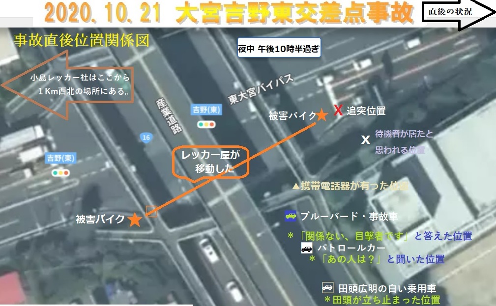 ◎待機人物は近くのレッカー社の社員田頭広明だった。彼は事故発生時の午後10時35分前から、実況検分が始まる午後11時18分頃まで40分間以上現場に留まって盛んに活動していたのだ。彼は、現場を片付けた後、会社へ戻り、又、今度はレッカー車に乗り換えて現場へ本来の仕事のために午後11時33分に出動した。事故現場から戻って直ぐの出動だから着替え時間を省略するために、予め作業着のままで事故現場で待機していたのだったのだ。そして、現場で待っていた平石健治と破壊したバイクとをレッカー車両に一緒に積みこんで平石健治の日進町の自宅駐車場迄運搬した。田頭広明は後日、私との電話で、「バイクと平石を一緒に自宅まで運んだ。」その時の様子を聞いた時彼は、「バイクは交差点の16号寄りの位置にあった。そこまで誰が運んだかわからない、バイクと一緒に平石を自宅まで運んだ。平石は知らない人だった。」と言った。そして交差点の図面を送りバイクの有った位置に印を付けるよう依頼して確認して貰い返送してきた。