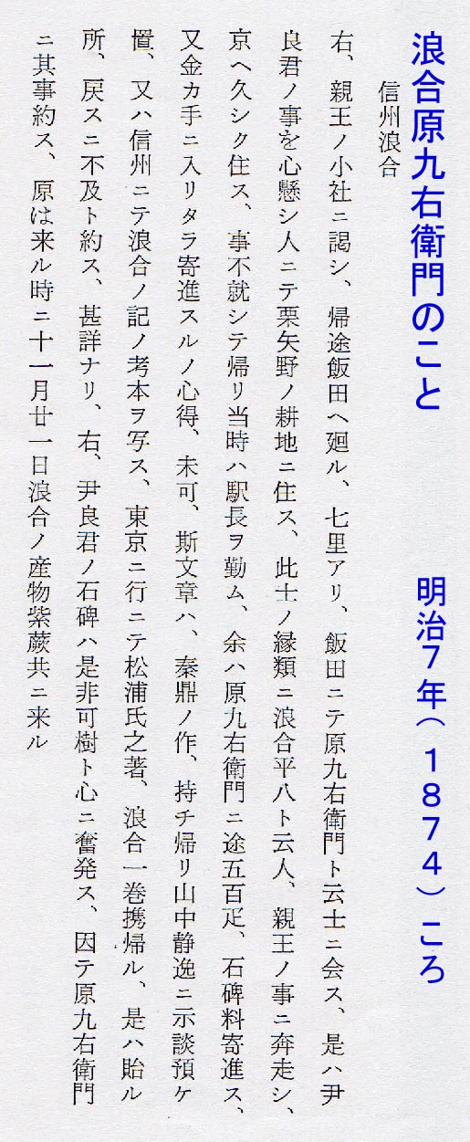 九右衛門さんとは、この飯田滞在中、尹良親王(タダヨシシンノウ=後醍醐天皇の孫)の記念石碑を浪合村に立てる件で何度も会談したようです。