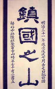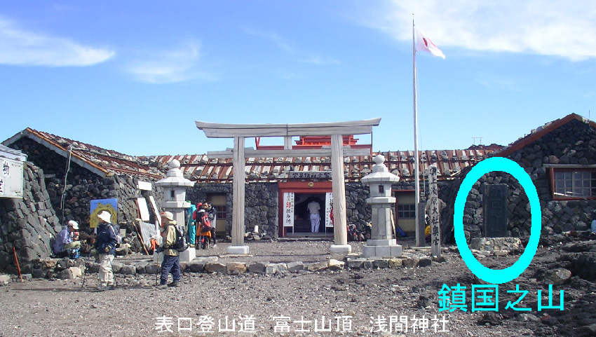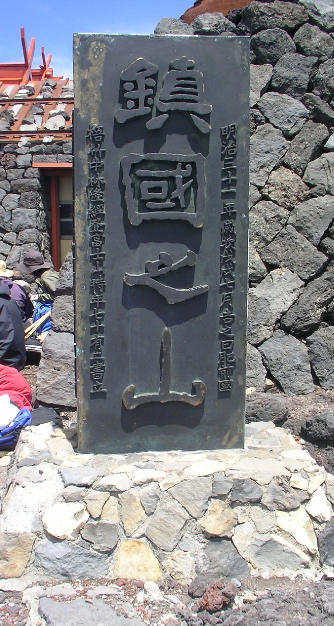 富士山頂の浅間神社奥宮の前に、「鎮国の山」という高さ1.5m、幅0.6m、厚さ0.3mのブロンズ(青銅)製の碑があるといわれます。明治31年の建立で、文字の揮毫は銀座の書聖といわれた中林梧竹、碑面は文字面が高くなっている陽刻です。建碑には当時不二教の後身である大日本実行会の教長であった伍和の原九右衛門と飯田の名士木下与八郎等が発起人でした。